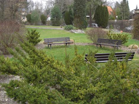 Der am alten Eingang des Dominikus-Krankenhauses gelegene Teich wurde durch ein Rondell ersetzt, dessen Rand mit Rosen bepflanzt wurde.